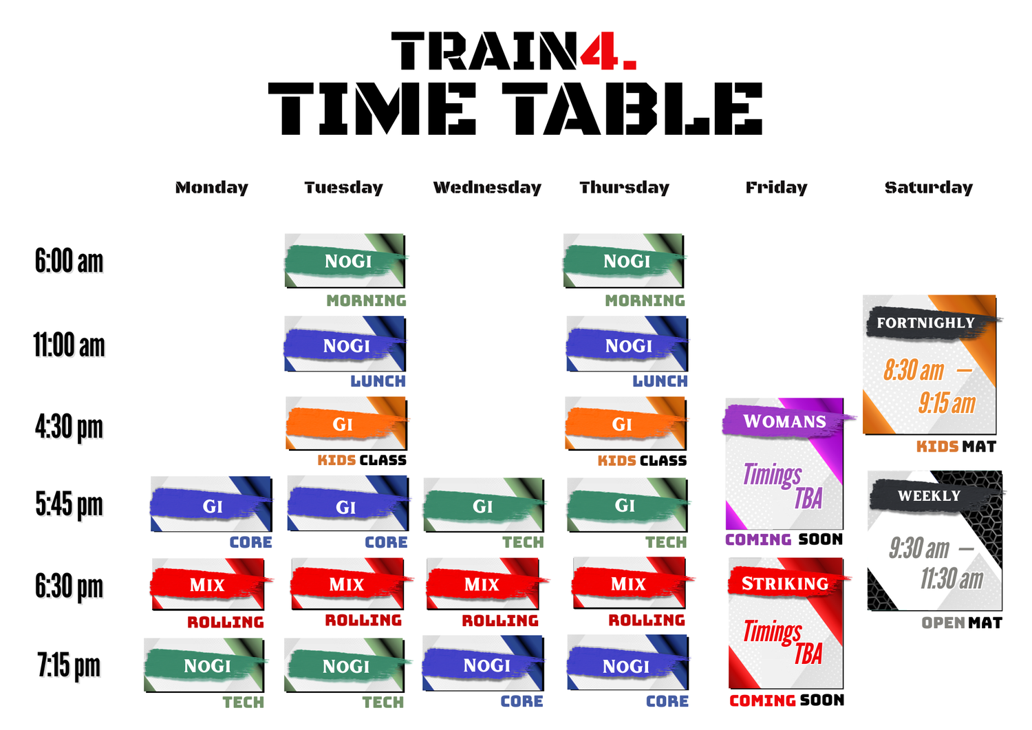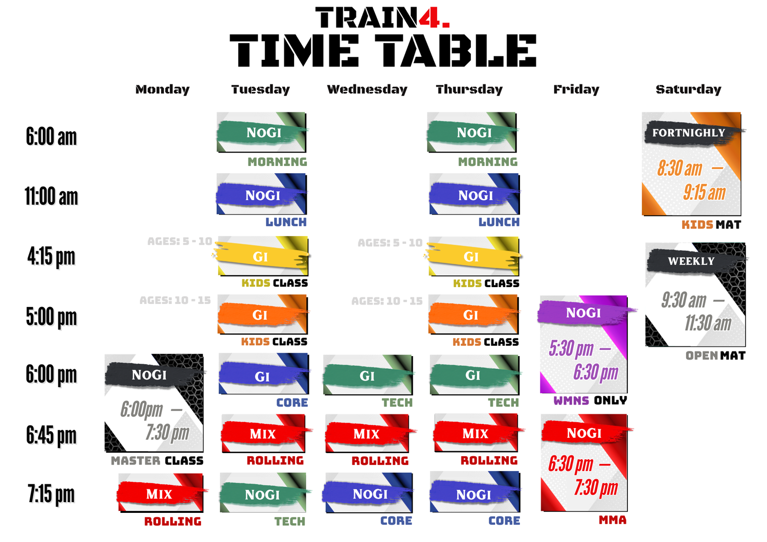 Class start times mark the beginning of the class so please aim to be ready to step on the mats for the timings marked on the schedule to keep the Academy running efficiently for everyone!